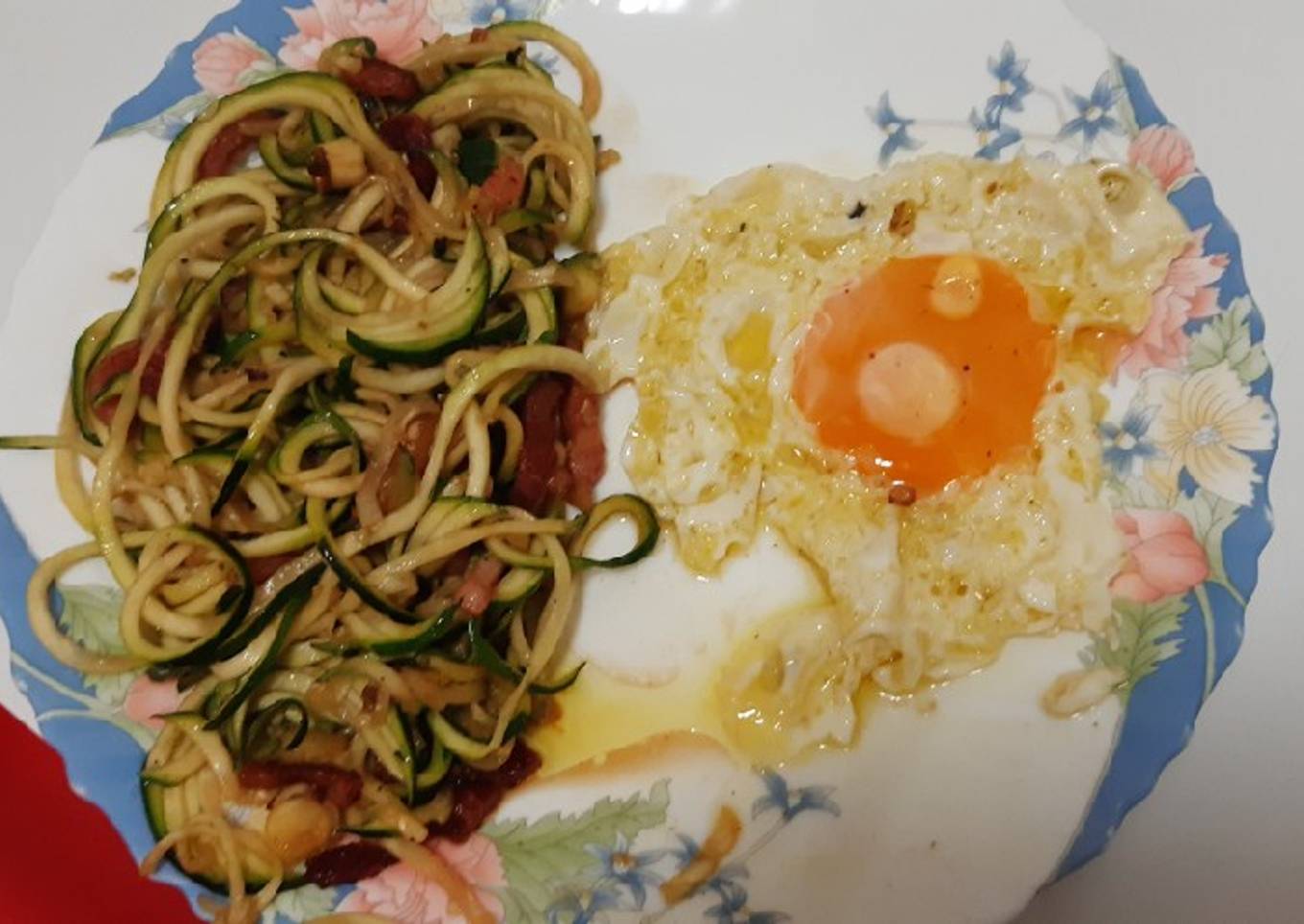 Huevo frito y espaguetis de calabacín al ajillo con bacon