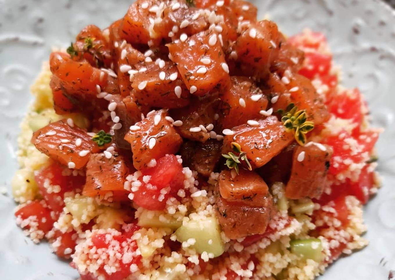 Ensalada de cuscús, pepino y tomate con salmón marinado