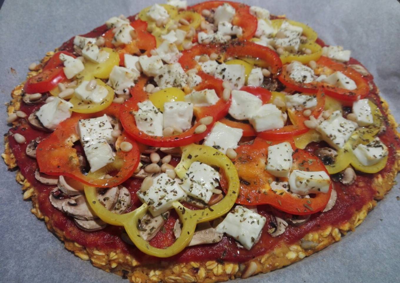 - Sacar la base de la pizza del horno, cubrir con salsa de tomate y orégano. Repartir uniformemente los champiñones, los pimientos, salpimentar y coronar con el queso feta, los piñones, terminar con más orégano y un hilito de aceite de oliva.