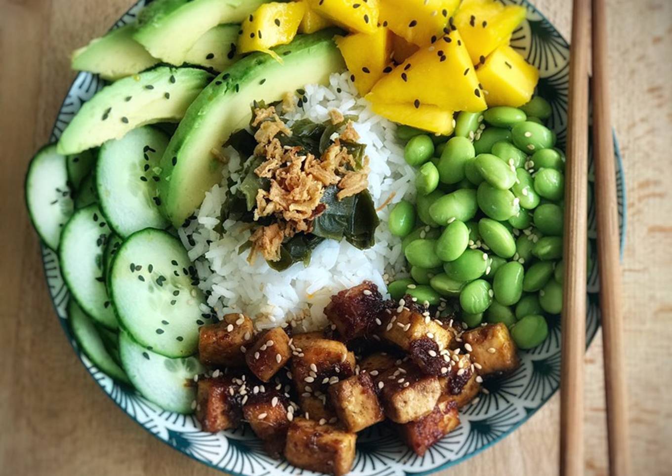 - Para presentar: en cuencos grandes ponemos una base de arroz (3 cucharadas) con unas gotas de aceite de sésamo, un puñadito de edamames, 1/3 de aguacate a rodajas, unas rodajitas de pepino muy finas, el mango a cubitos, 1/3 del tofu caramelizado, en el centro un poquito de alga wakame, y espolvoreamos un poco de sésamo tostado, sésamo negro y la cebolla frita.