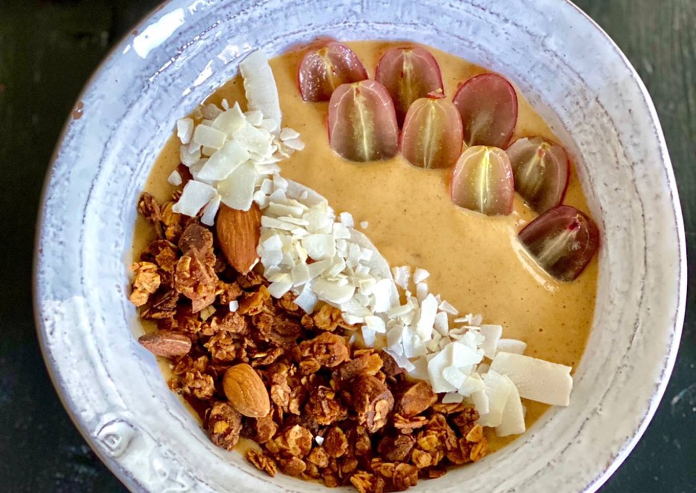 - Servir con los toppings al gusto, en mi caso: uvas, granola casera y lascas de coco y listo ✅