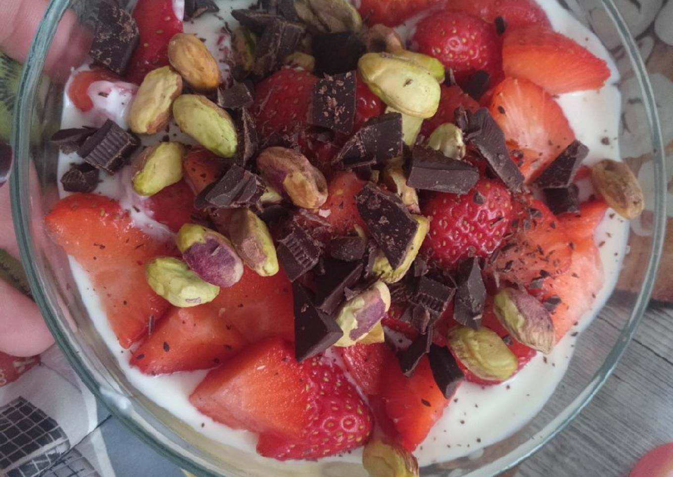 - Añade al yogur las fresas, los pistachos pelados y la onza de chocolate a trocitos pequeños