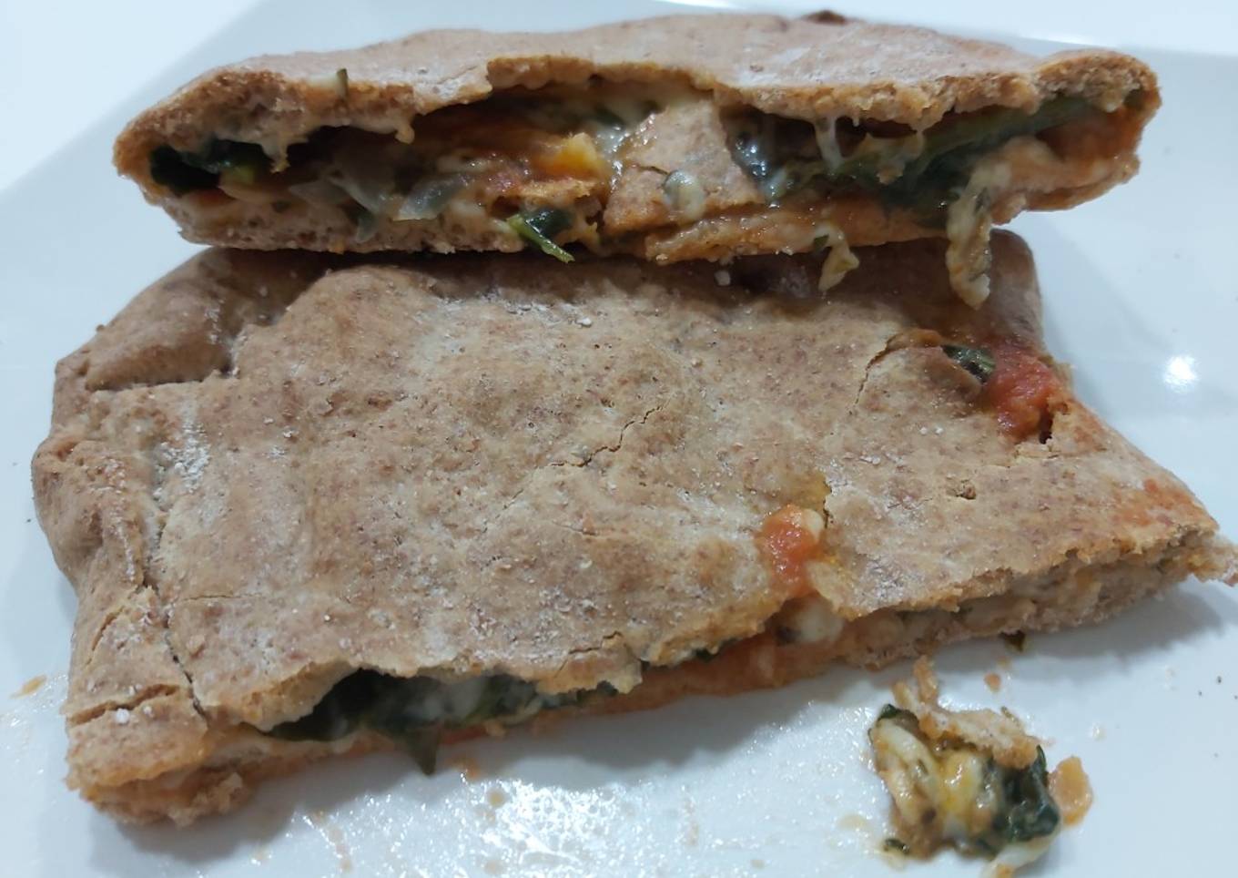 La masa del calzone es casera, con espelta integral, la he rellanado con salsa de tomate casero y espinacas...