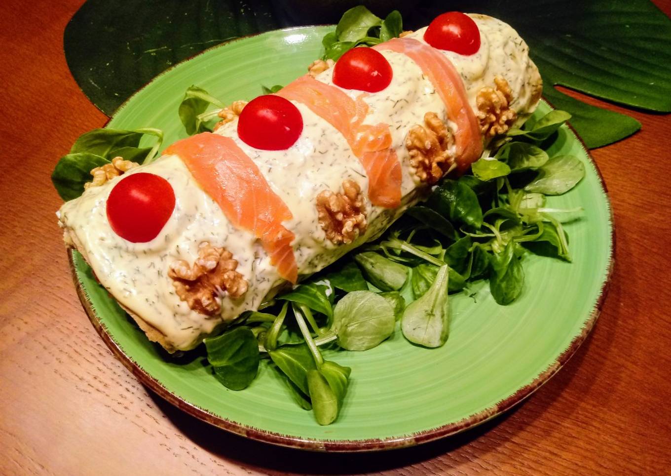 Brazo de gitano salado de salmón y guacamole (saludable)