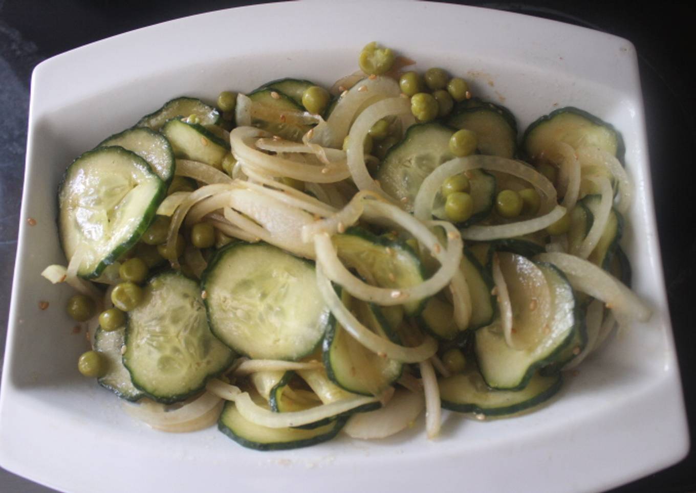 - Escurrimos el líquido que conserva los guisantes y añadimos estos al pepino y la cebolla.