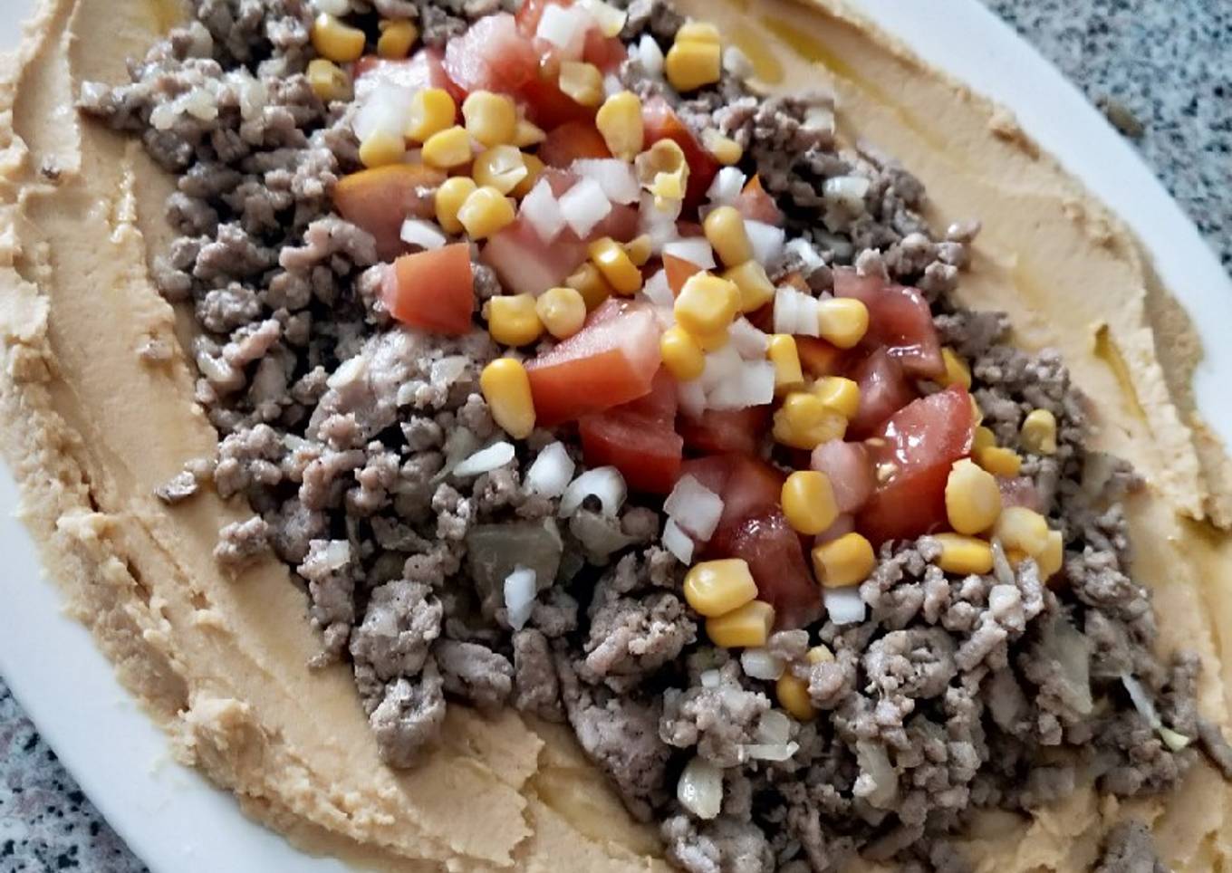 - En un plato se coloca en los bordes el hummus y en el centro la carne picada. Luego se echa encima del hummus, un chorrito de aceite de oliva.