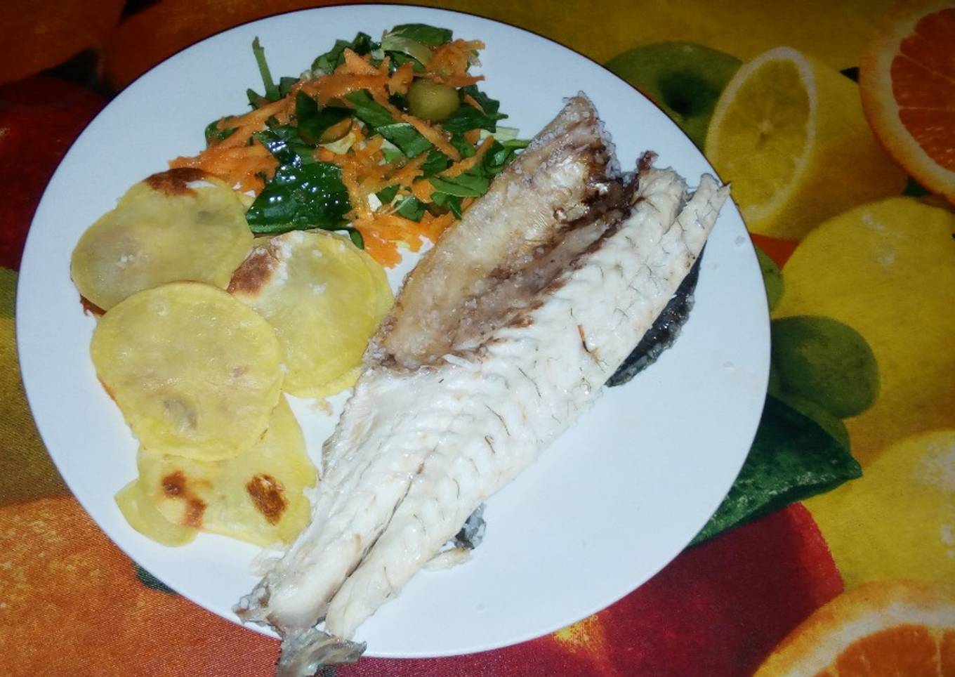 - Después de retirar la sal, podemos proceder a emplatar, acompañando con la patata y un poco de ensalada. La foto no hace justicia a lo sabrosa que ha quedado la lubina. Buen provecho!