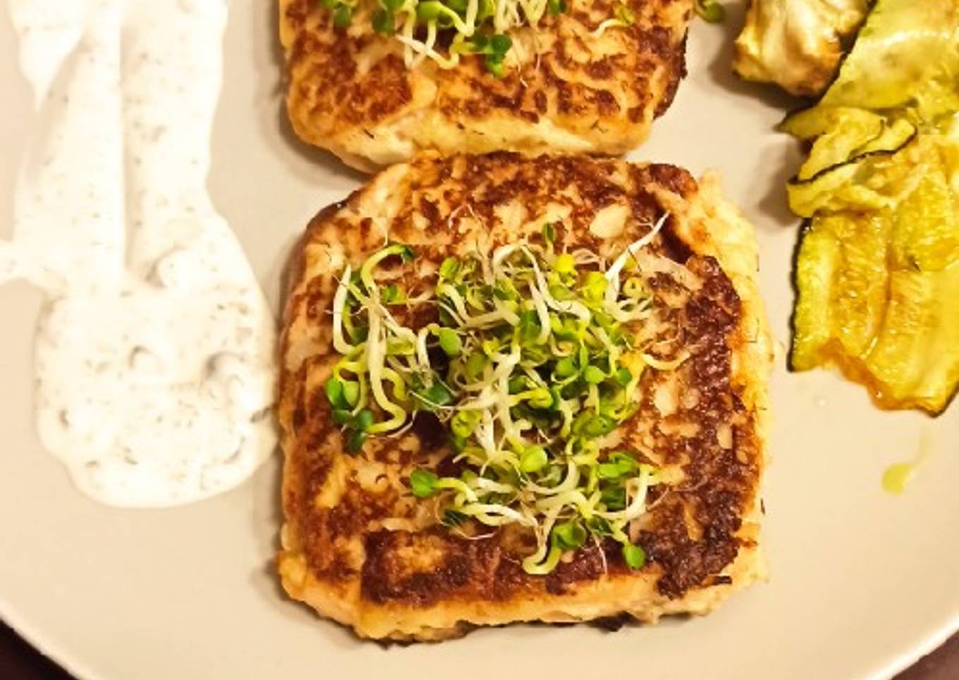 Hamburguesas de salmón con salsa tártara, germinados