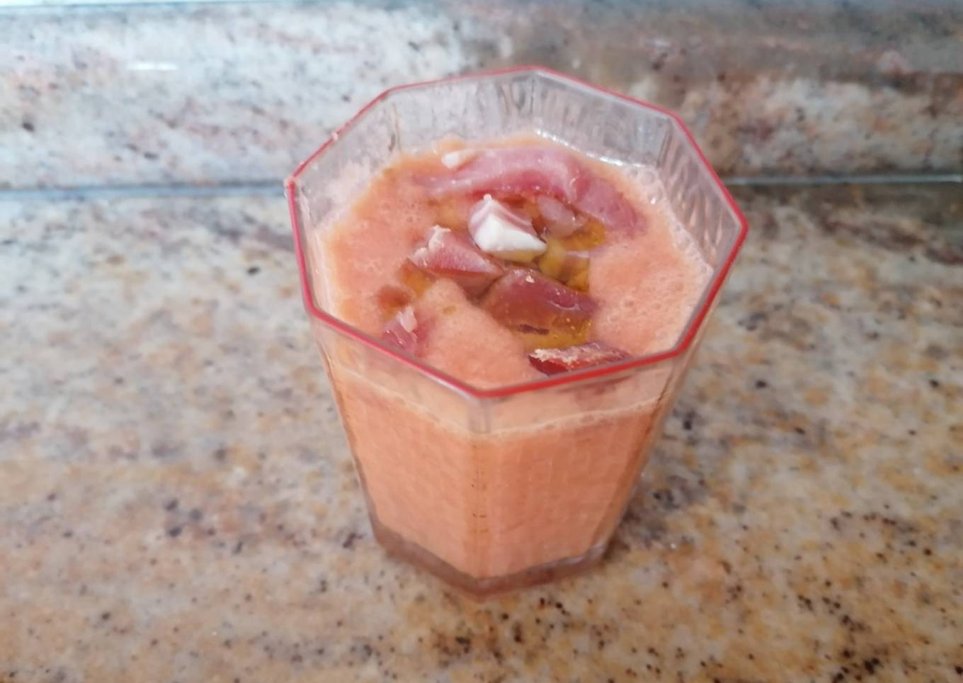 - . Enfríalo en el frigorífico. Pica también el jamón ibérico en taquitos. Sirve el salmorejo y coloca encima.