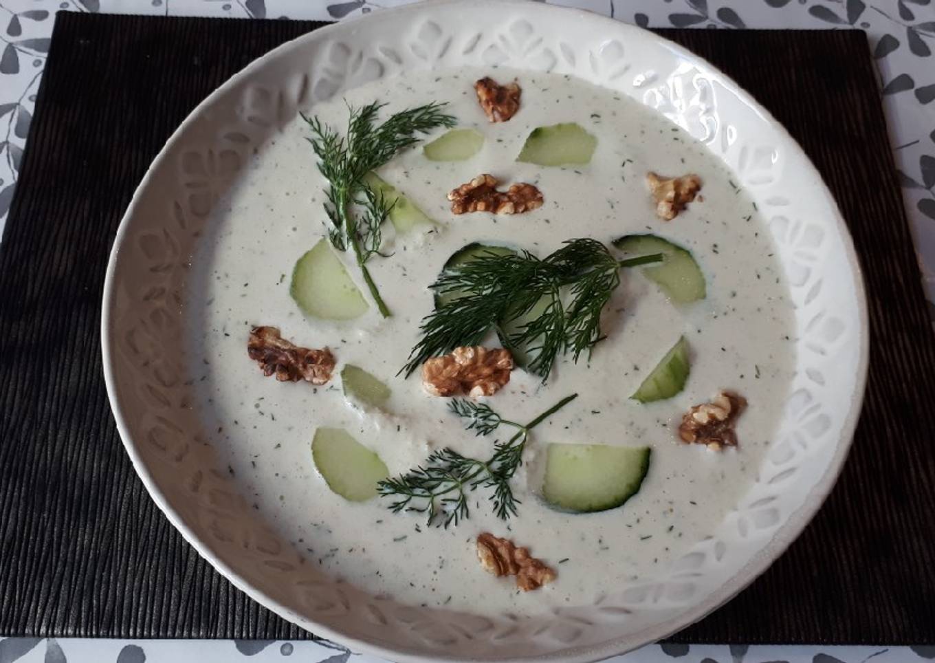 - Y aquí tenemos esta fantástica sopa fría de yogur y pepino o Tarator, como se la conoce en los Balcanes. ¡Una sopa realmente exquisita!