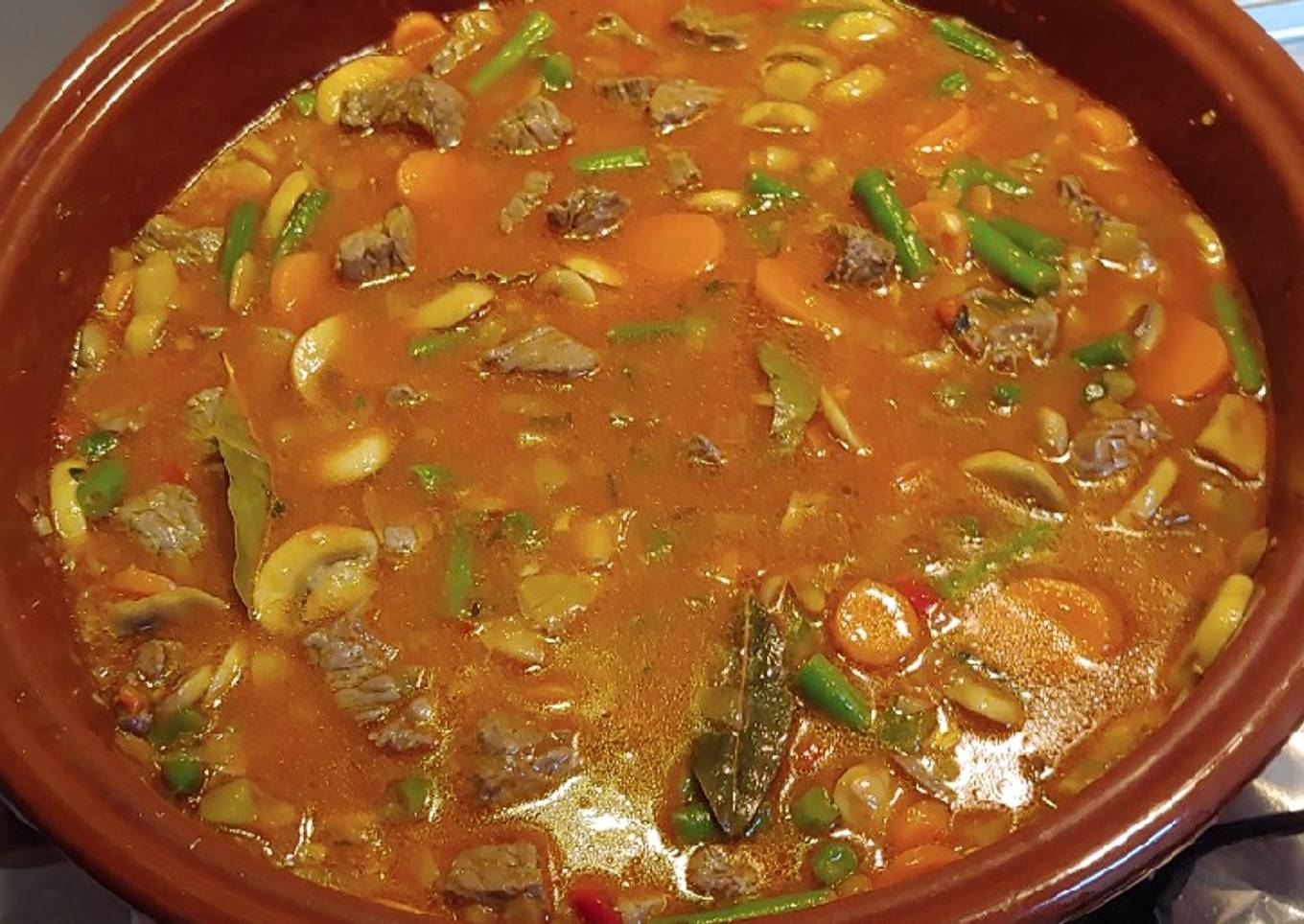 - Ir pochando y cada 7 minutos vamos introduciendo en olla de barro.en otra olla de ira Preparando un Caldo de Verduras como. Una cebolla, ajo, tomate, apio un chorrito aceite de Oliva y laurel sal y pimienta.