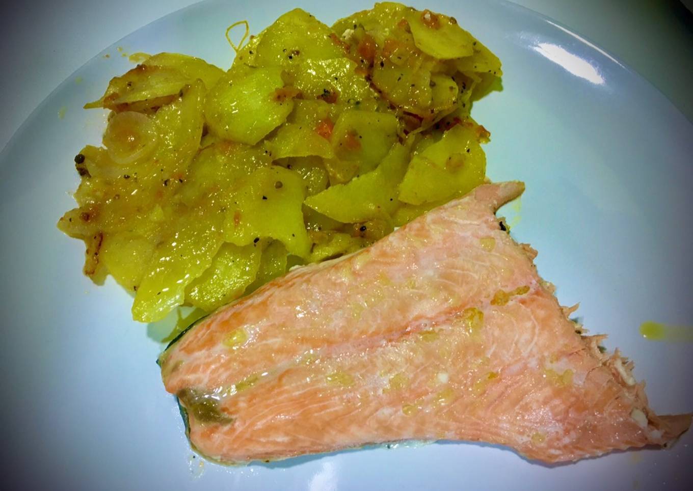 - Colocas el salmón encima de la patata, le echas sal y un chorro de aceite por encima, lo dejas 10 minutos y ya está.