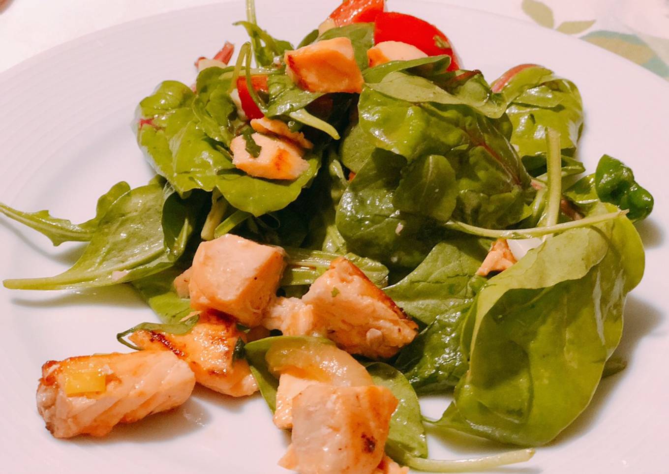 Ensalada de espinacas de la huerta española con salmón a la plancha